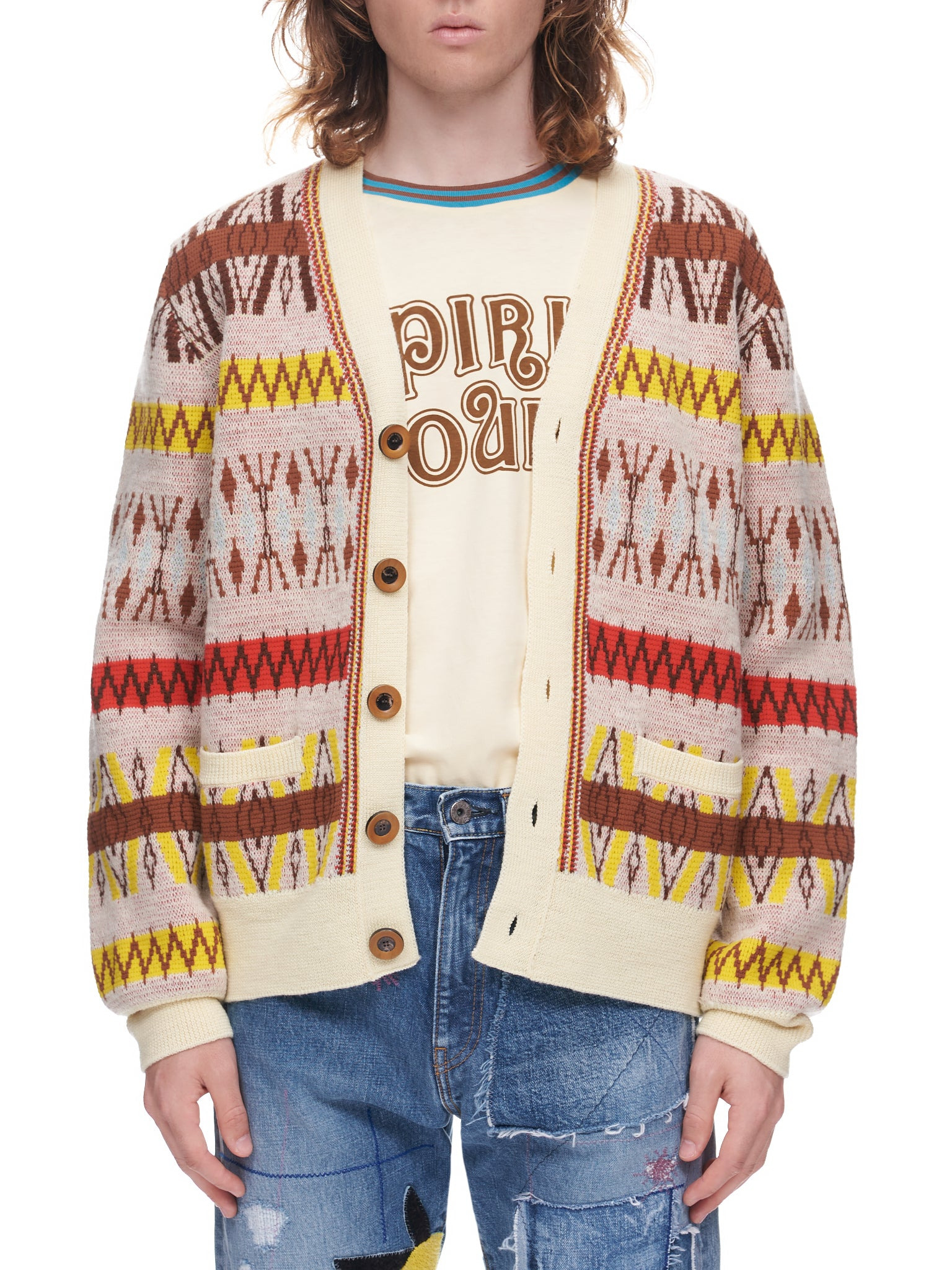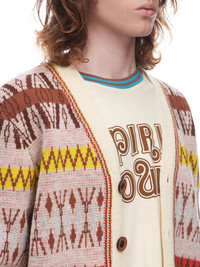 Wales Bonner sweater in multicolor, inspired by Swedish folk textiles of the 1970's, two-tone buttons with branded engraving, v-neck, two pockets, hip length, unisex. Made in Romania Numeric Sizing 4: M 5: L Composition: 58% Wool, 42% Polyproytlene Model is 5'9" and is wearing size 4. Shoulders: 18" Chest: 37" Waist: 29"