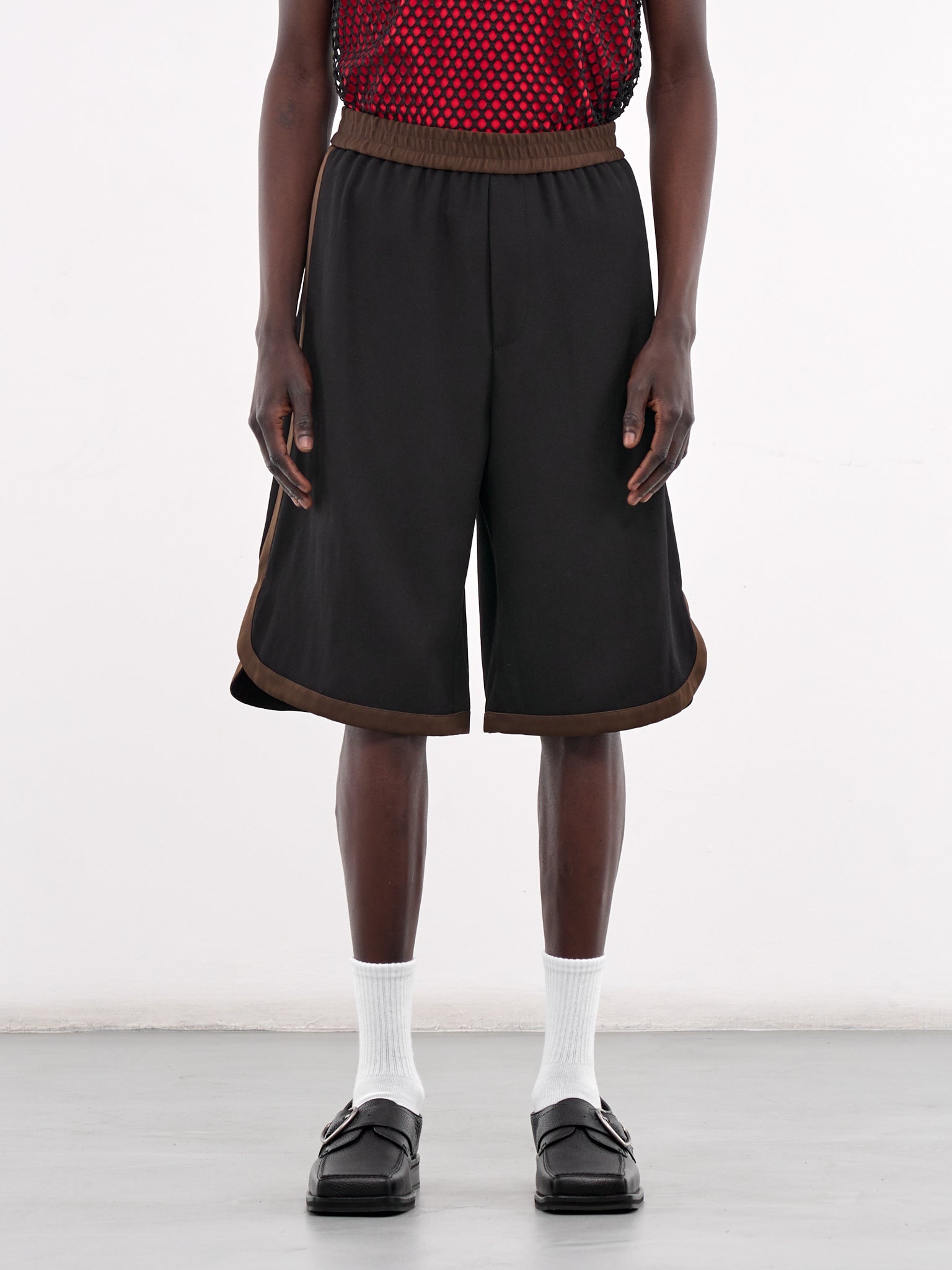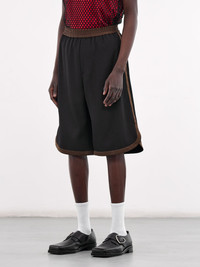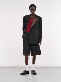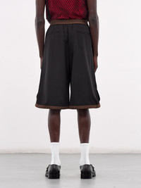 WALES BONNER shorts in black & brown, paneled wool construction, contrast paneling, elasticated waistband, side pockets, back welt pockets, side vents, straight hem, knee-length, wide leg, baggy fit. Made in Italy Main: 100% Virgin Wool Fabric 2: 100% Cotton Fabric 3: 100% Polyester Italian Sizing Model is 5'11.5" wearing size 48. Shoulders: 16" Chest: 32.5" Waist: 30"