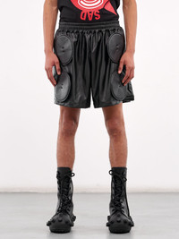 WALTER VAN BEIRENDONCK shorts in black, paneled construction, trompe l'oeil button applique embellishments throughout, elasticated waistband, waist gathering & ruching, side pockets, back patch pockets, straight hem, above-knee length, wide leg, relaxed fit. Standard/Italian Sizing Model is 6'1" wearing size L/50. Shoulders: 19" Chest: 38" Waist: 28"