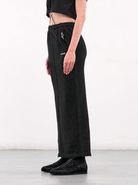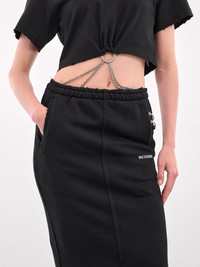 WE11DONE skirt in black, paneled cotton construction, light distressing, elasticated waistband, side welt pockets, pocket metal eyelets & piercing embellishment, side logo detailing, front seam, back vent, straight hem, maxi-length, relaxed fit. Made in South Korea 100% Cotton Standard Sizing Model is 5'8" wearing size S. Bust: 32" Waist: 24" Hips: 35"
