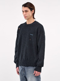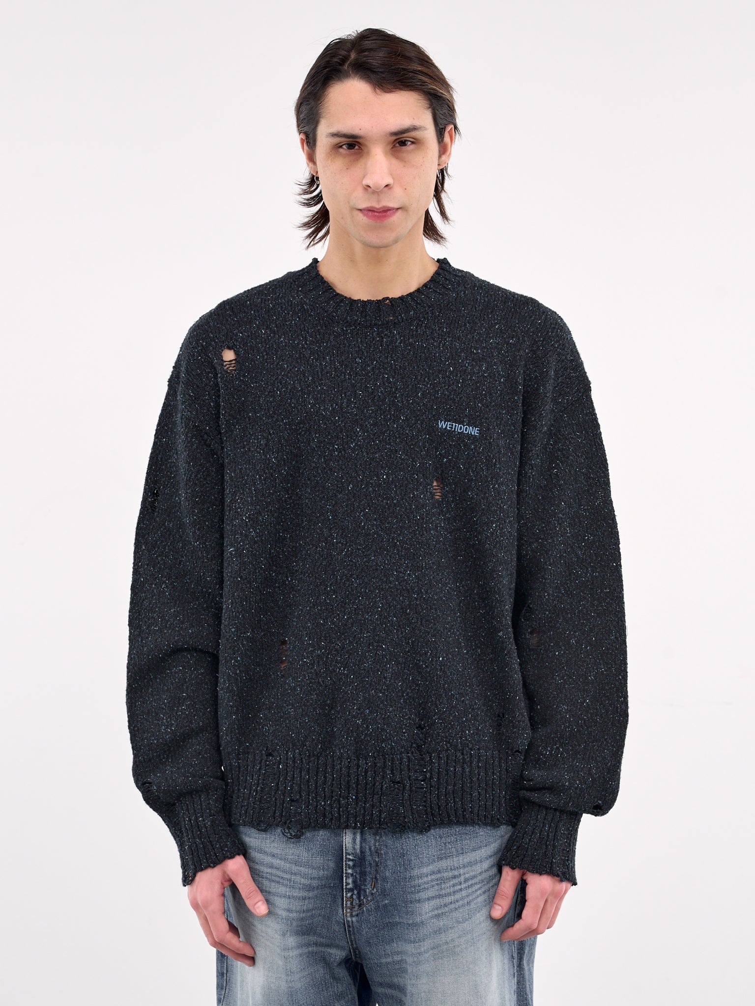 WE11DONE sweater in navy, cotton-linen blend, paneled knit construction, distressing throughout, speckled knit, ribbed crewneck, long sleeves, rib-knit cuffs & hem, chest logo embroidery, straight hem, relaxed fit. Made in South Korea 60% Cotton 30% Linen 10% Silk Standard Sizing Model is 6'1” and wears a size M. Shoulders: 17” Chest: 33” Waist: 30”