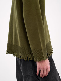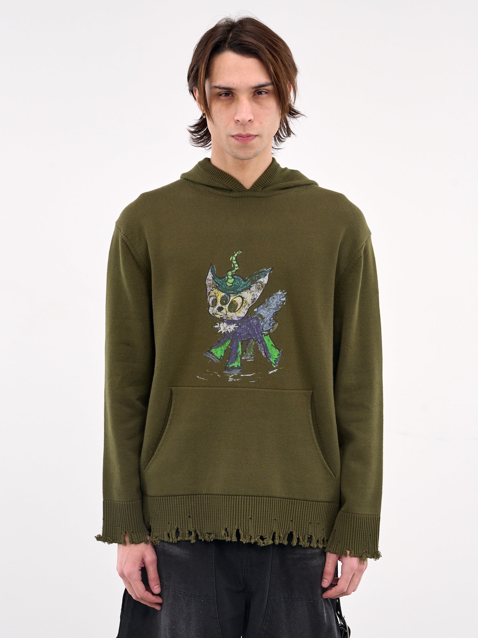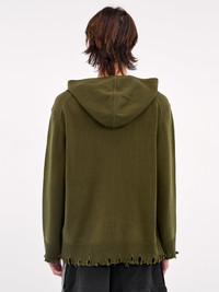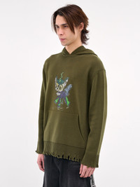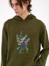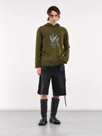 WE11DONE hoodie in khaki, paneled cotton knit construction, printed graphic, distressing throughout, hood, long sleeves, rib-knit cuffs & hem, kangaroo pocket, straight hem, relaxed fit. Made in South Korea 100% Cotton Standard Sizing Model is 6'1” and wears a size M. Shoulders: 17” Chest: 33” Waist: 30”