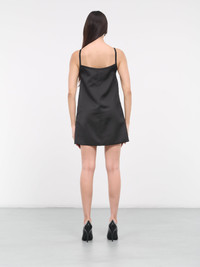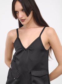 WE11DONE dress in black, paneled satin construction, v-neckline, shoulder straps, sleeveless, armscyes, partially open back, side zip patch pocket, side flap pocket, front gathering, straight hem, mini-length, relaxed fit. Made in Korea 100% Polyester Standard Sizing Model is 5'8" wearing size S. Bust: 32" Waist: 26" Hips: 34.5"