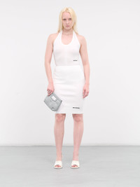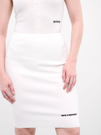 WE11DONE skirt in white, pencil skirt design, viscose-poly blend, paneled knit construction, rib-knit, fitted waist, back buttoned placket closure, back vent, front logo detailing, straight hem, knee-length, slim fit. Made in Korea 72% Viscose 28% Polyester Standard Sizing Model is 5'8" wearing size S. Bust: 30" Waist: 24" Hips: 33.5"