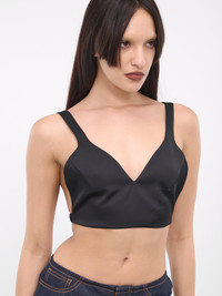 WE11DONE bra in black, paneled satin construction, sweetheart neckline, adjustable shoulder straps, sleeveless, armscyes, back elasticated band, straight hem, cropped length, slim fit. Made in Korea 100% Polyester Standard Sizing Model is 5'8" wearing size S. Bust: 32" Waist: 26" Hips: 34.5"