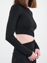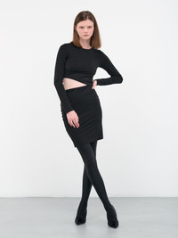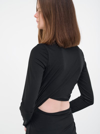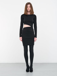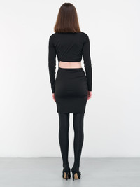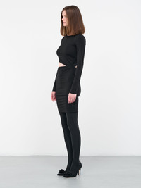 WOLFORD x N°21 dress in black, bio-degradable fabric, matte finish, round collar, long sleeves, asymmetric waist cut-out, drape details, free-cut edges, mini length, fitted. Standard Sizing 89% Modal, 11% Elastane Model is 5'10" wearing size XS. Bust: 32" Waist: 24" Hips: 35"