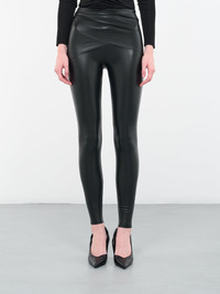 WOLFORD x N°21 pants in black, paneled draped design, stretch vegan leather, mid-elastic waist, full length, fitted. French Sizing Body - 96% Polyester, 4% Elastane Coating - 100% Polyurethane Model is 5'10" wearing size 34. Bust: 32" Waist: 24" Hips: 35"