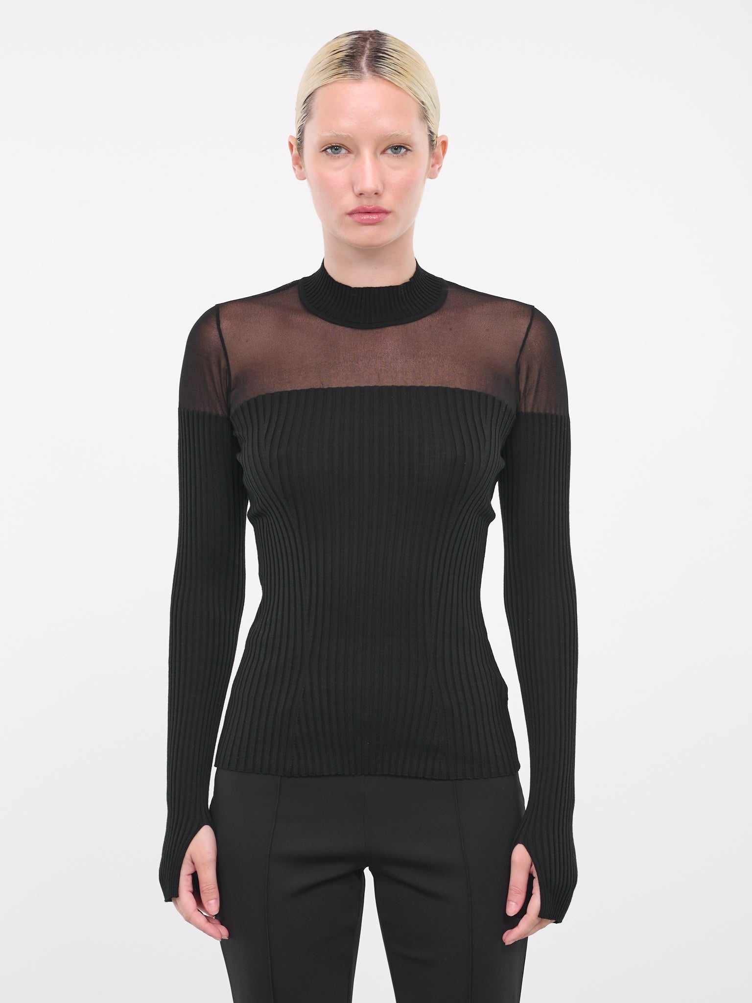 WOLFORD x SIMKHAI black top, virgin wool, rib knit, mesh insert, mock neck, elongated sleeves, slit cuffs, fitted. 100% Virgin Wool Standard Sizing Model is 5'9" wearing size XS. Bust: 32" Waist: 24" Hips: 34"