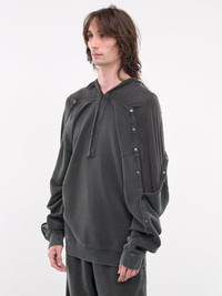 Y/PROJECT hoodie in black, paneled cotton construction, vintage wash, snap-button overlay, hood, adjustable drawstring, long sleeves, elasticated cuffs & hem, snap-button sleeves, straight hem, oversized fit. Made in Bulgaria 100% Cotton Standard Sizing Model is 6'1" wearing size M. Shoulders: 17" Chest: 34" Waist: 28.5"