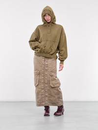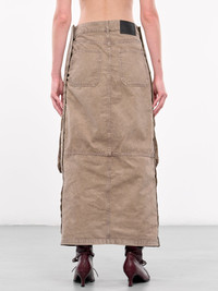 Y/PROJECT skirt in khaki, paneled cotton construction, washed effect, high waist, belt loops, back logo patch, paneled velcro skirt overlay, back patch pockets, side cargo pockets, straight hem, maxi-length, relaxed fit. Made in Portugal 100% Cotton French Sizing Model is 5'8" wearing size 36. Bust: 31" Waist: 23.5" Hips: 34"