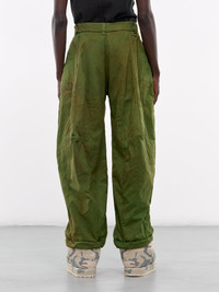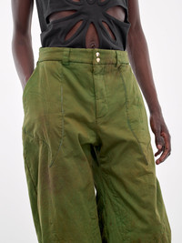 YAKU trousers in green, paneled cotton construction, asymmetric draped paneling throughout, dirtied effect, graphic topstitching, belt loops, front button & concealed zip fly closure, inset pockets, lined, wide leg, loose fit. Made in UK Outer: 100% Cotton Inner: 100% Polyester Standard Sizing Model is 5'11.5" wearing size L. Shoulders: 16" Chest: 32.5" Waist: 30"