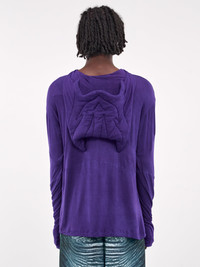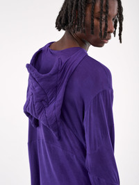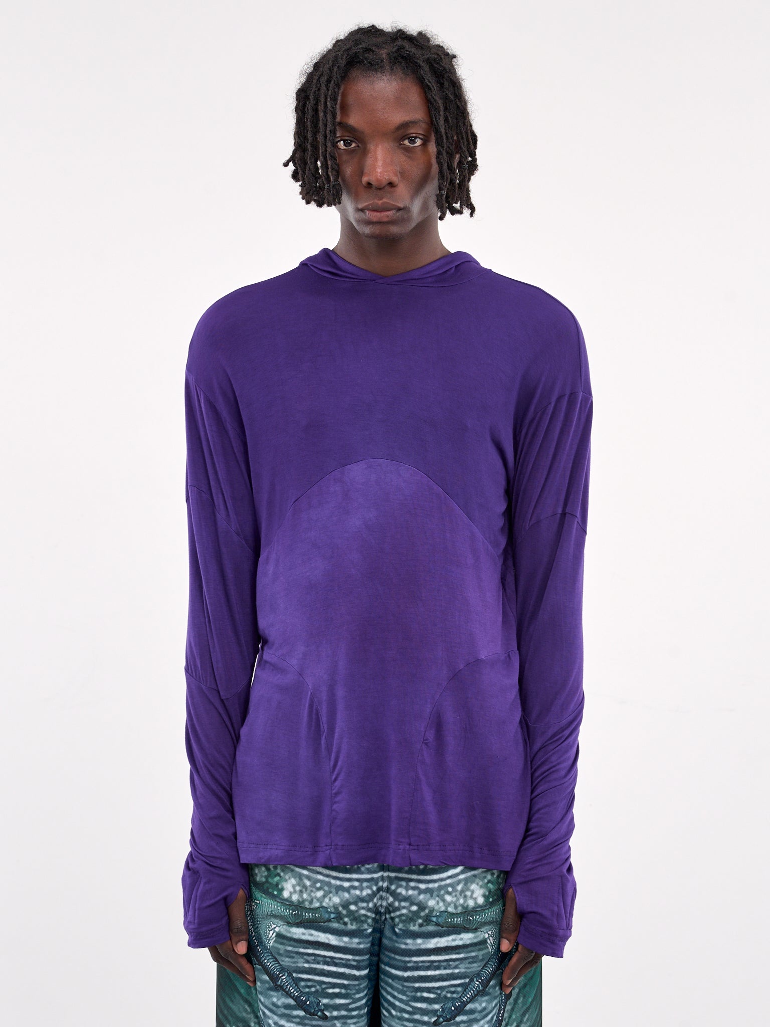 YAKU top in purple, paneled modal construction, hood & graphic quilted detailing, elongated sleeves, thumbholes, front curved seams, straight hem, relaxed fit. Made in UK 100% Modal Standard Sizing Model is 6’2” wearing size M. Shoulders: 19” Chest: 38” Waist: 28”