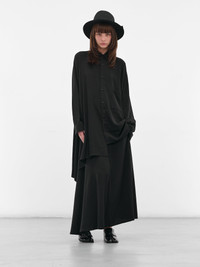 Black flared trousers in crepe de Chine with a soft, lustrous finish. The flowing drape gives the silhouette a skirt-like refinement while maintaining versatile wear. Featuring: • Relaxed fit • Crepe de Chine construction • Soft sheen and asymmetric drapery • Flared leg resembling a skirt • Versatile styling • Maxi-length • Made in Japan • 57% Triacetate 43% Polyester • Japanese sizing Model is 5'7" wearing size 1. Bust: 30" Waist: 22" Hips: 33"