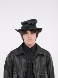 YOHJI YAMAMOTO hat in black, crumpled design, paneled construction, ribbed knit, crumpled & wrinkled effect, round brim, lined. Made in Japan Japanese Sizing