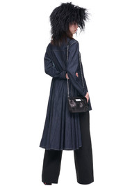 Yohji Yamamoto dress in dark wash denim, lapel collar, long sleeves, contrasting front button closure, contrasting bleached desgin, asymmetric hemline, back pleated construction. Made in Japan Japanese Sizing Composition: 100% Cotton Model is 5'9" and is wearing size 1. Bust: 32" Waist: 24" Hip: 34"