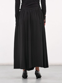 YOHJI YAMAMOTO skirt in black, paneled construction, high waist, elasticated waistband, waist adjustable buttoned strap, ruching & shirring, pleated effect, straight hem, maxi-length, relaxed fit. Japanese Sizing Model is 5'7" wearing size 1. Bust: 34" Waist: 26" Hips: 34"