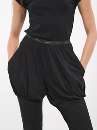 YOHJI YAMAMOTO black leggings, jersey cotton construction, signature sketch-style Yohji graphic, logo branded elasticated waistband, patch pockets, skinny fit. Made in Japan 100% Cotton Japanese Sizing Model is 5'8" wearing size 1. Bust: 32" Waist: 26" Hips: 34.5"