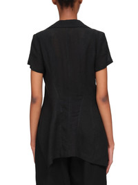 Yohji Yamamoto short sleeve swallowtail jacket in black, notched lapel collar, puffed cap sleeves, open front, droptail hem. Made in Japan. Japanese Sizing. Composition: 100% Flax Model is 5ft 8” and wearing a size 2. Bust: 32” Waist: 24” Hip: 35"