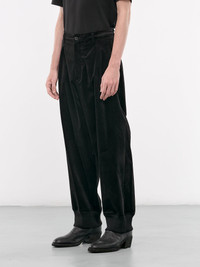 YOHJI YAMAMOTO trousers in black, paneled velvet construction, belt loops, front button & concealed zip fly closure, pleated, side pockets, back buttoned welt pockets, ribbed cuffs, tapered leg, loose fit. Made in Japan Outer: 98% Cotton 2% Polyurethane Parts: 100% Wool Japanese Sizing Model is 6'1" wearing size 2. Shoulders: 17" Chest: 34" Waist: 28.5"