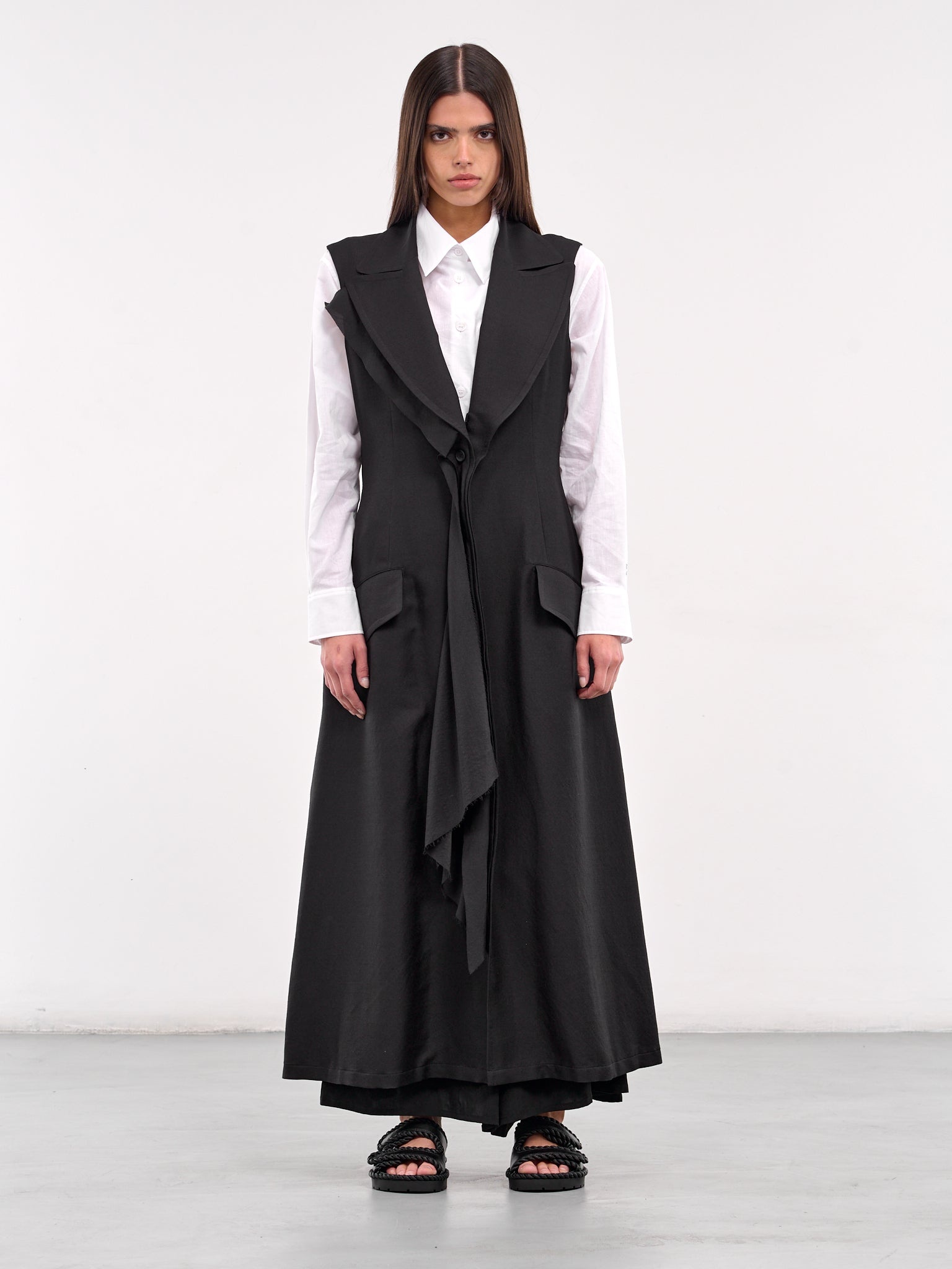 YOHJI YAMAMOTO dress in black, wool-silk blend, paneled construction, notched lapel, v-neckline, sleeveless, armscyes, layered button placket closure, bodice darting, side flap pockets, back vent, layered hems, maxi-length, relaxed fit. Made in Japan Main: 75% Wool 25% Silk Parts: 80% Wool 20% Silk Japanese Sizing Model is 5'8" wearing size 3. Bust: 32.5" Waist: 24" Hips: 34"