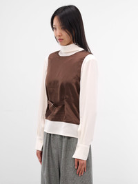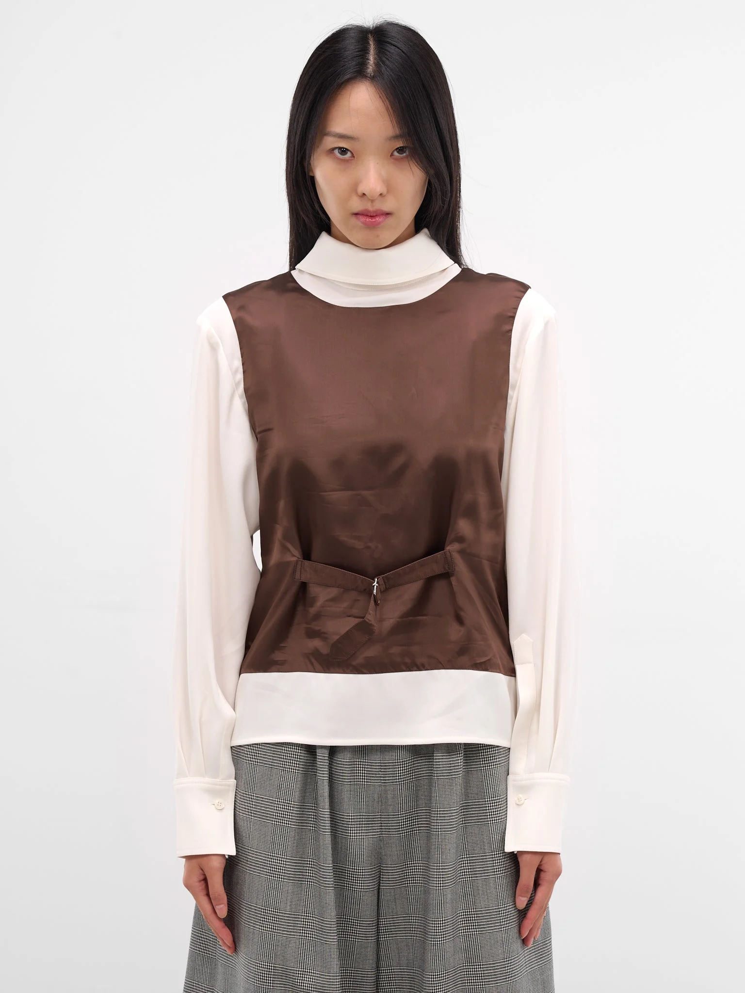 Featuring: • Relaxed fit • Backwards layered waistcoat and shirt design • Backwards spread collar • Long sleeves • Button cuffs • Front cinch strap • Backwards waistcoat detailing and layering • Made in Hungary • Main: 74% Acetate 26% Polyester | Secondary: 100% Wool • Standard sizing Model is 5'10" wearing size S. Bust: 31” Waist: 22” Hips: 33”