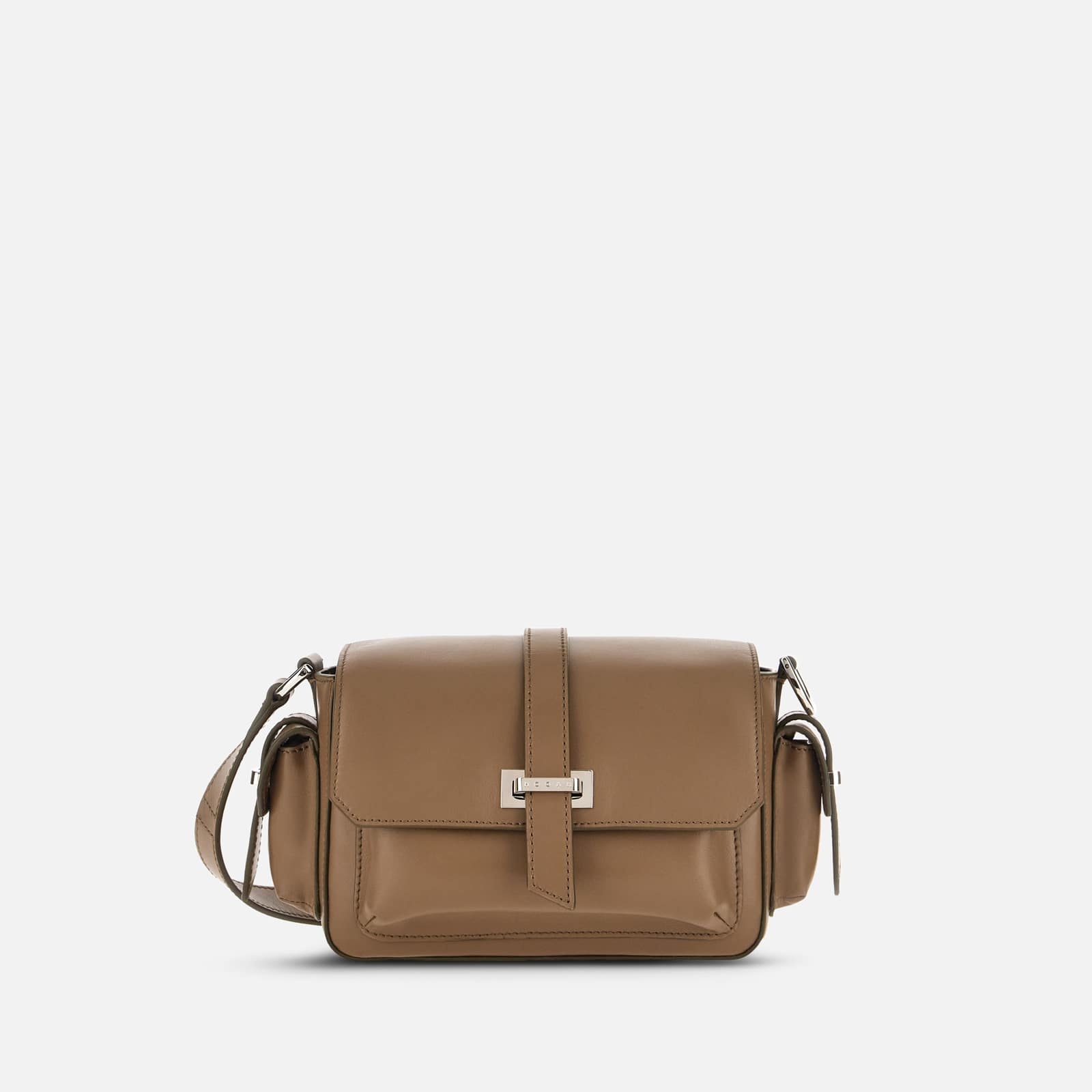 - Women's Hogan Flap Bag - Item crafted in leather - Semi-concealed front pocket - Side pockets with flap and straps - Branded metal loops - Flap and strap closure - Dimensions: 7.9 x 5.5 x 3 ins - Versatile shoulder strap: extended/double handle - Maintenance and care cards included - Fabric dustbag included Compact but voluminous, functional but stylish. New interpretation of the classic camera bag, this model in soft leather is perfect for the everyday look. A flap with engraved metal logo on the strap keeper characterizes both the central compartment and sides. Featuring a semi-concealed front pocket, it comes with a shoulder strap for carrying crossbody or over the shoulder.
