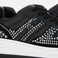 - Women's Hogan Atelier H630 Sneakers - Made in Italy - Smooth leather upper - Suede inserts - 972 applied rhinestones - Memory foam insole 0.4 ins - Rubber outsole - Total height 1.6 ins - Maintenance and care cards included - Fabric dustbag included - Additional laces included Result of painstaking craftsmanship, the Hogan H630 sneakers in Atelier version are enhanced by the numerous rhinestones of different dimensions. Crafted in smooth leather with suede inserts, they come with the characteristic extended side H. The outsole is crafted in extralight EVA, with embossed logo on the side, while the memory foam insole ensures cushioning to this decidedly glam style.