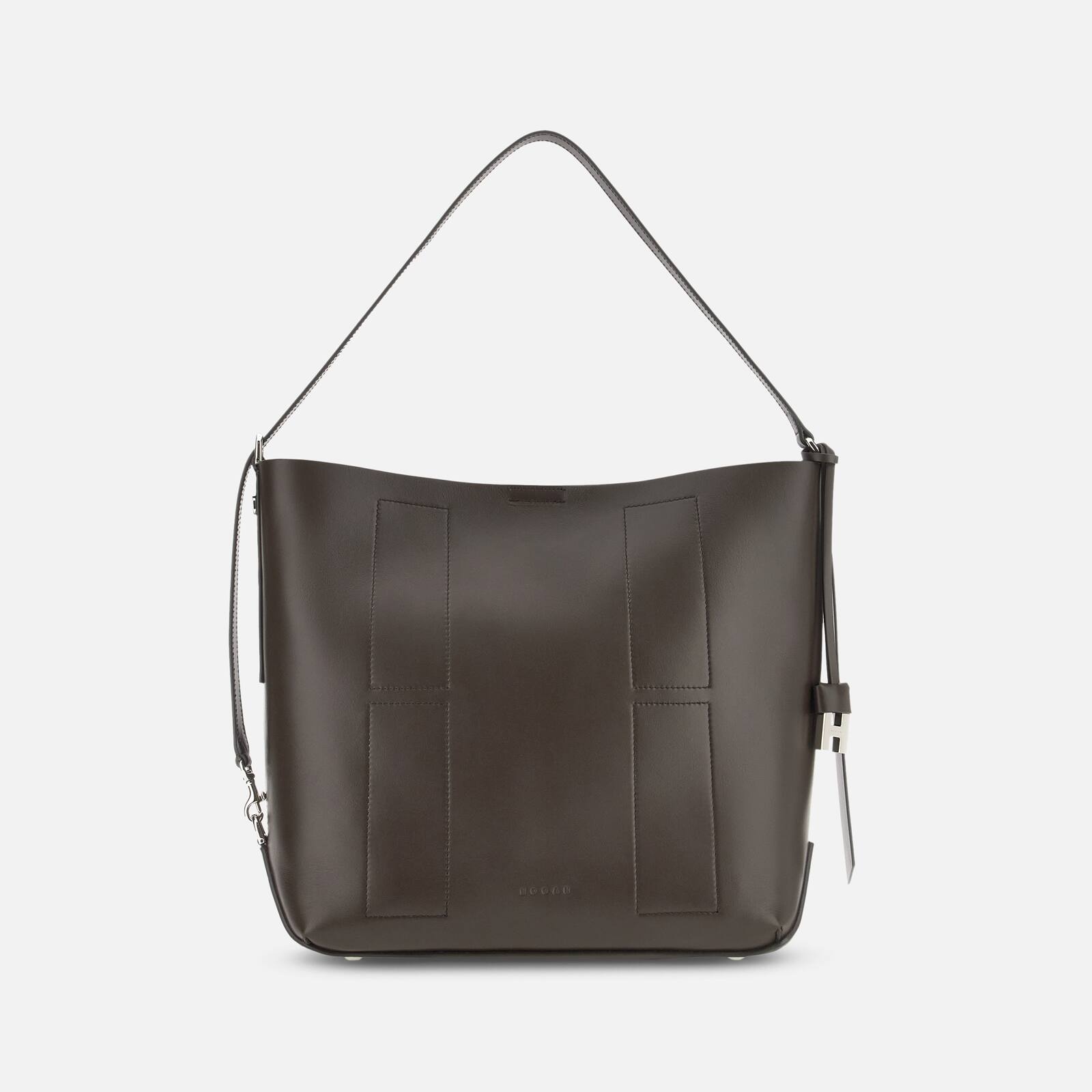 - Women's hobo bag - Item crafted in leather - Hogan logo stamped on the front and side - H charm pendant - Dimensions: 16.1 x 12.8 x 5.7 ins - Adjustable versatile shoulder strap - Magnetic button closure - Internal removable pouch - Metal feet - Maintenance and care cards included - Fabric dustbag included Finished with distinctive stitching outlining a maxi H, this rectangular hobo bag features the Hogan logo stamped on the front and a metal H charm on the side, covered in leather. Crafted in soft leather, it can be worn in versatile ways: crossbody, over the shoulder in a classic way, sideways as a bucket bag effect, or by hand and under the arm, folded up. A creation with an ever-changing twist, complemented by a practical pouch.