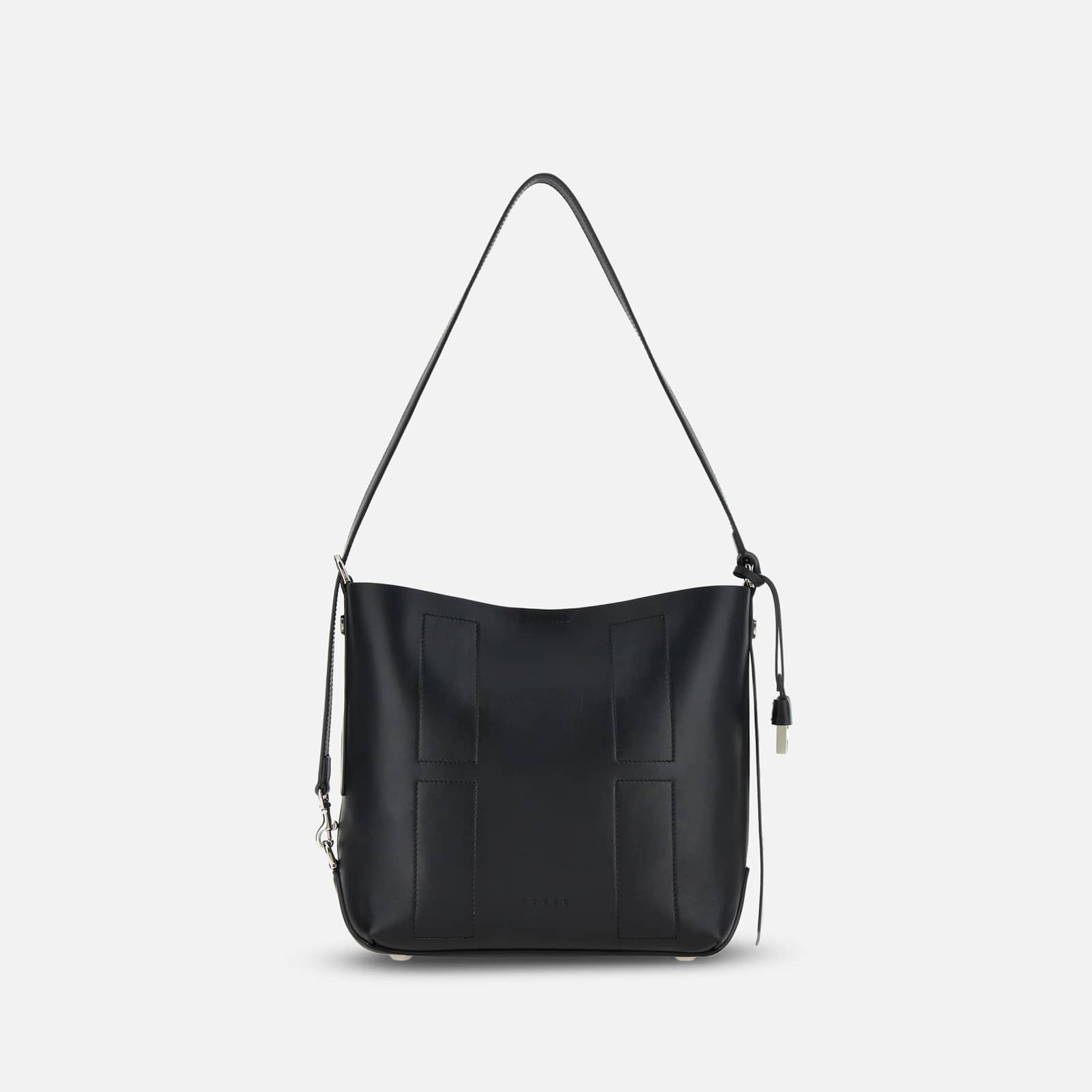 - Women's hobo bag - Item crafted in leather - Hogan logo stamped on the front and side - H charm pendant - Dimensions: 11 x 10.2 x 4.3 ins - Adjustable versatile shoulder strap - Magnetic button closure - Internal removable pouch - Metal feet - Maintenance and care cards included - Fabric dustbag included Finished with distinctive stitching outlining a maxi H, this rectangular hobo bag features the Hogan logo stamped on the front and a metal H charm on the side, covered in leather. Crafted in soft leather, it can be worn in versatile ways: crossbody, over the shoulder in a classic way, sideways as a bucket bag effect, or by hand and under the arm, folded up. A creation with an ever-changing twist, complemented by a practical pouch.