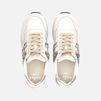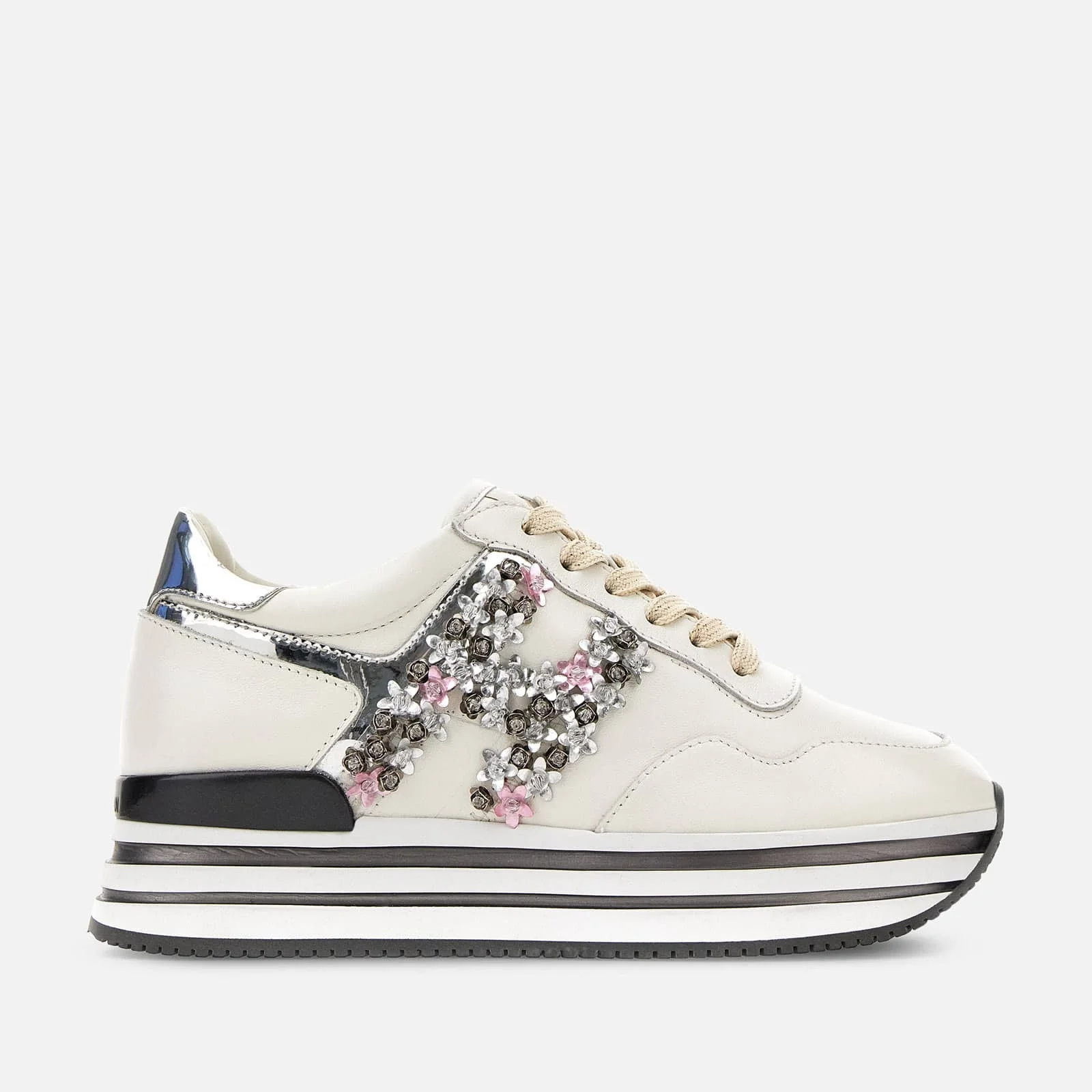 - Women's Hogan Midi H222 Sneakers - Made in Italy - Leather upper - Mirror fabric inserts - Side H with floral applications - Removable insole 0.3 ins - Ultra-light EVA outsole - Total height 2.2 ins - Maintenance and care cards included - Branded dustbag included As the result of painstaking and dedicated craftsmanship, these Midi sneakers in smooth leather with mirror inserts are characterized by refined floral applications that compose a side H. A precious style with a glam-sporty spirit, with the iconic ultra-light outsole designed to slender the silhouette. MOD. HVW4830EV10OWR024E