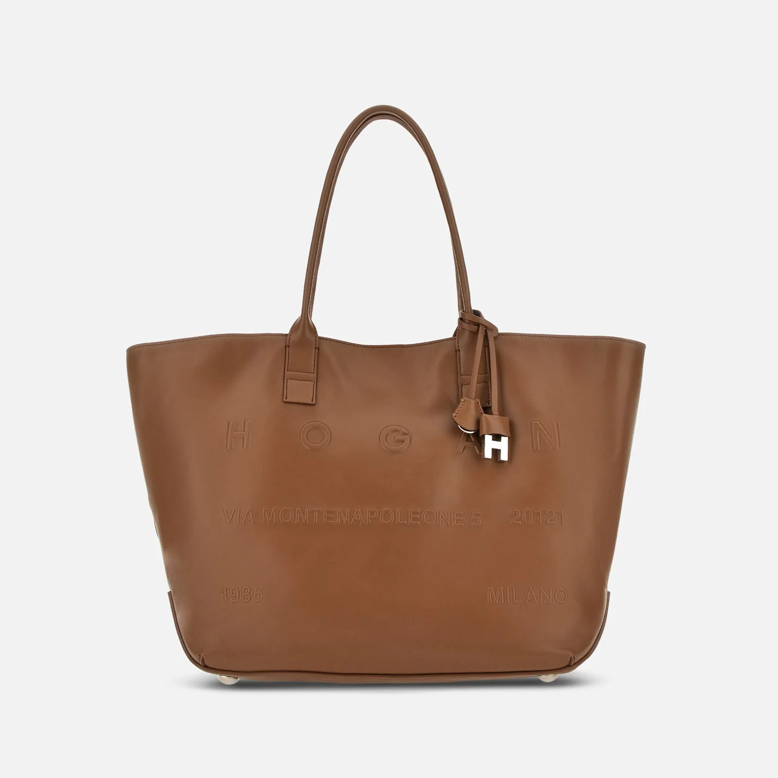 - Women's shopping bag - Item crafted in leather - Embossed Via Monte Napoleone address logo - Dimensions: 19.7 x 11.8 x 6.1 ins - Fixed handles - Magnetic button closure - Removable zipped pouch - Metal feet - Maintenance and care cards included - Fabric dustbag included The distinctive shopping bag with the brand's address is revisited with the high-frequency technique. Featuring the embossed logo, this smooth leather version comes with two fixed handles, a wide compartment closed with a magnetic button and internal removable pouch. A key holder pendant and the metal H-Fob charm complement the style.
