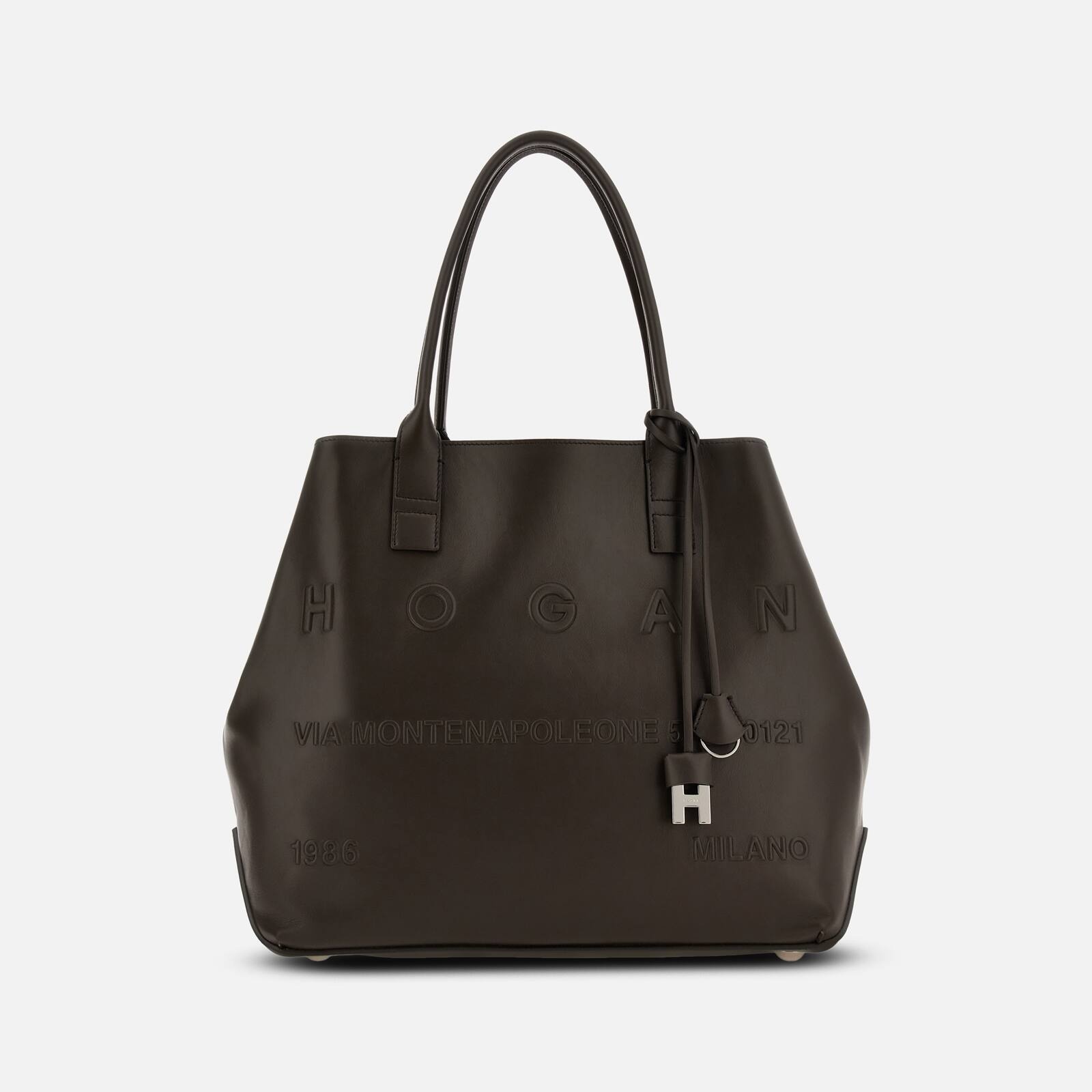 - Women's shopping bag - Item crafted in leather - Embossed Via Monte Napoleone address logo - Coated metal H pendant - Pendant with coated key ring - Dimensions: 19.7 x 11.8 x 6.1 ins - Fixed handles - Adjustable lace closure - Internal zipped pocket - Metal feet - Maintenance and care cards included - Fabric dustbag included Lighter and more relaxed upgrade of the Script address shopping bag, with the iconic brand address stamped in relief. Characterized by thinner handles and a wide adjustable compartment with slim straps, it is crafted in soft leather. Featuring an internal pouch, it is enhanced by a keyholder and metal H-Fob pendant.