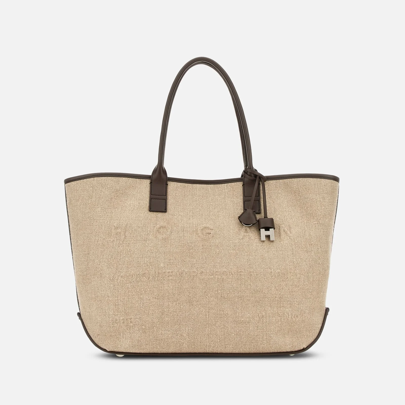 - Women's shopping bag - Item crafted in linen - Smooth leather inserts - Embossed Via Monte Napoleone address logo - Dimensions: 19.7 x 11.8 x 6.1 ins - Fixed handles - Magnetic button closure - Internal zipped pocket - Metal feet - Maintenance and care cards included - Fabric dustbag included The distinctive shopping bag with the brand's address comes here in a lightweight version, with a summer mood. Featuring the embossed logo, this declination in canvas comes with two fixed handles in leather and a wide compartment closed with a magnetic button. A key holder pendant and the metal H-Fob charm complement the style.
