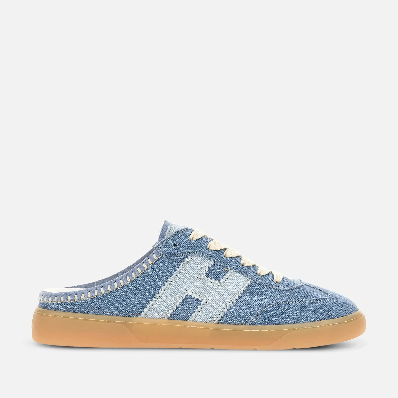 - Women's Hogan Cool Mules - Stone washed denim upper - Serrated side H - Suede detailing - Soft insole - Rubber (TPU) cupsole - Total height 1.3 ins - Maintenance and care cards included - Fabric dustbag included - Additional laces included Perfect mix of retro elements and contemporary lines, the Hogan Cool style comes here in a mule version. Featuring a padded tongue, the upper here is crafted in denim, with fringed trim and a serrated side H. The outsole recalls the slanted monogram on the tread, while the memory foam insole guarantees a cushioned fit.