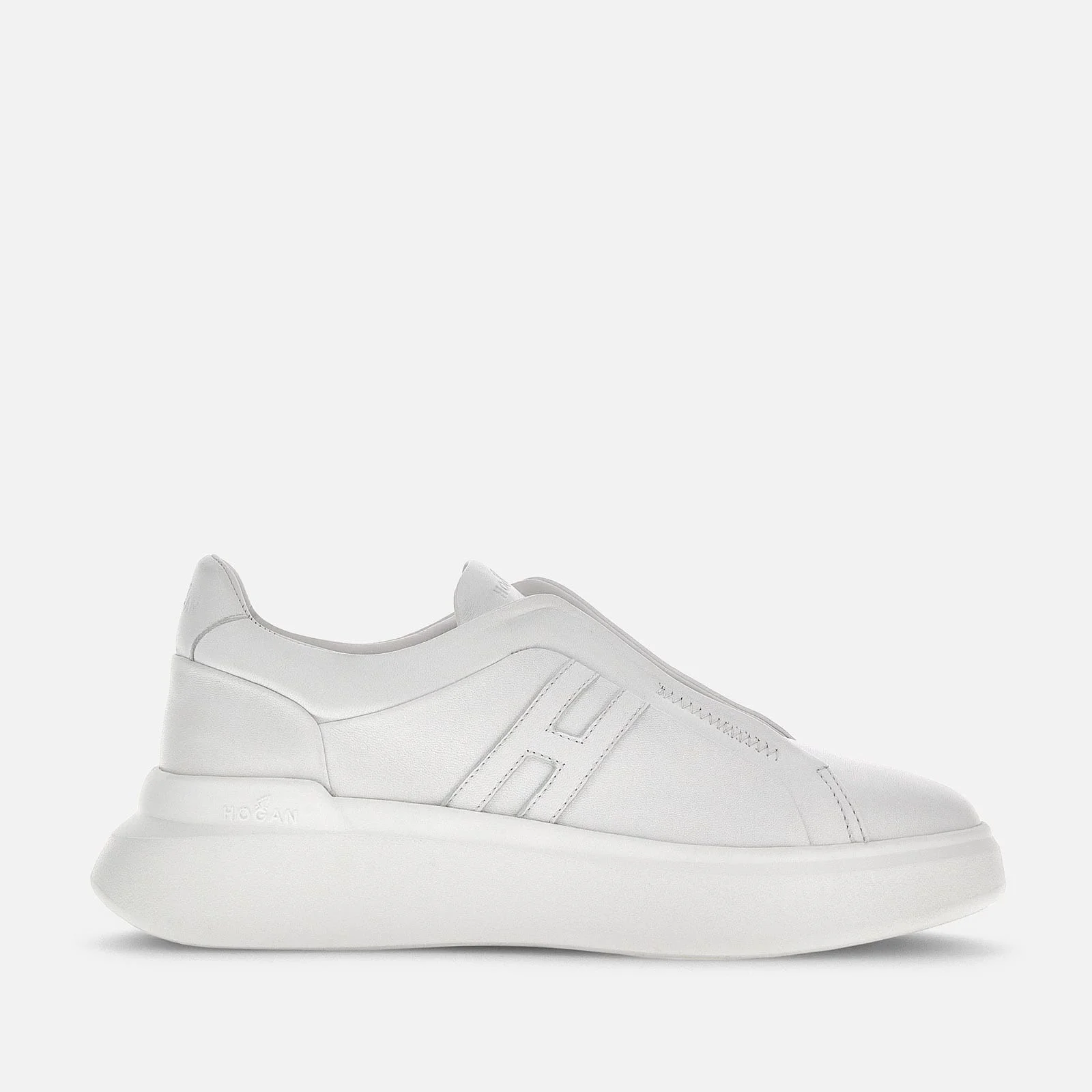 - Men's Hogan H580 Slip-On Sneakers - Made in Italy - Nappa leather upper - Side H - Concealed elastic inserts - Memory foam insole 0.3 ins - Rubber outsole - Total height 1.8 ins - Maintenance and care cards included - Fabric dustbag included The Hogan H580 sneakers were designed with the wind and its flow in mind, with harmonious volumes and an aerodynamic outsole. Here proposed in slip-on version, they are crafted in nappa leather, with soft lines and side H. An urban casual style with a memory foam insole that guarantees a cushioned fit. MOD. HXM5800BE00LE9B001