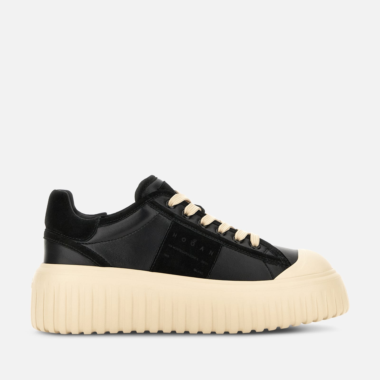 - Women's Hogan H-Stripes Sneakers - Made in Italy - Nappa leather upper - Suede inserts - Address logo stamped on the side - Hogan logo stamped on the tongue - Memory foam insole 0.3 ins - EVA outsole - Total height 2.3 ins - Maintenance and care cards included - Fabric dustbag included - Additional laces included Style with sporty and versatile lines, the H-Stripes sneakers feature an extralight outsole with vertical stripes. This version in nappa leather and suede features the address logo on the side and a rubber toe that recalls vintage sneakers. The memory foam insole guarantees a comfortable and cushioned fit.