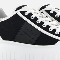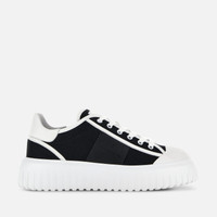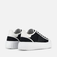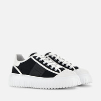 - Men's Hogan H-Stripes Sneakers - Made in Italy - Cotton upper - Leather inserts - Address logo stamped on the side - Hogan logo stamped on the tongue - Leather lining - Memory foam insole 0.3 ins - EVA outsole - Total height 1.9 ins - Maintenance and care cards included - Fabric dustbag included Style with sporty and versatile lines, the H-Stripes sneakers feature an extralight outsole with vertical stripes. This version in canvas and smooth leather features the address logo on the side and a rubber toe that recalls vintage sneakers. The memory foam insole guarantees a comfortable and cushioned fit.