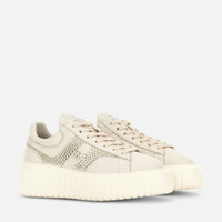 - Women's Hogan H-Stripes Sneakers - Made in Italy - Nappa leather upper - Suede and rhinestone side H - Memory foam insole 0.3 ins - EVA outsole - Total height 2.3 ins - Maintenance and care cards included - Fabric dustbag included - Additional laces included Style with sporty and versatile lines, the H-Stripes sneakers feature an extra-light outsole with vertical stripes. The upper, with a compact and balanced design, is characterized by a suede and rhinestone side H that extends across the side. The upper trim, with stitching on the back patch, features a soft padding. This version is crafted in nappa leather, with a memory foam insole that guarantees comfortable cushioning.