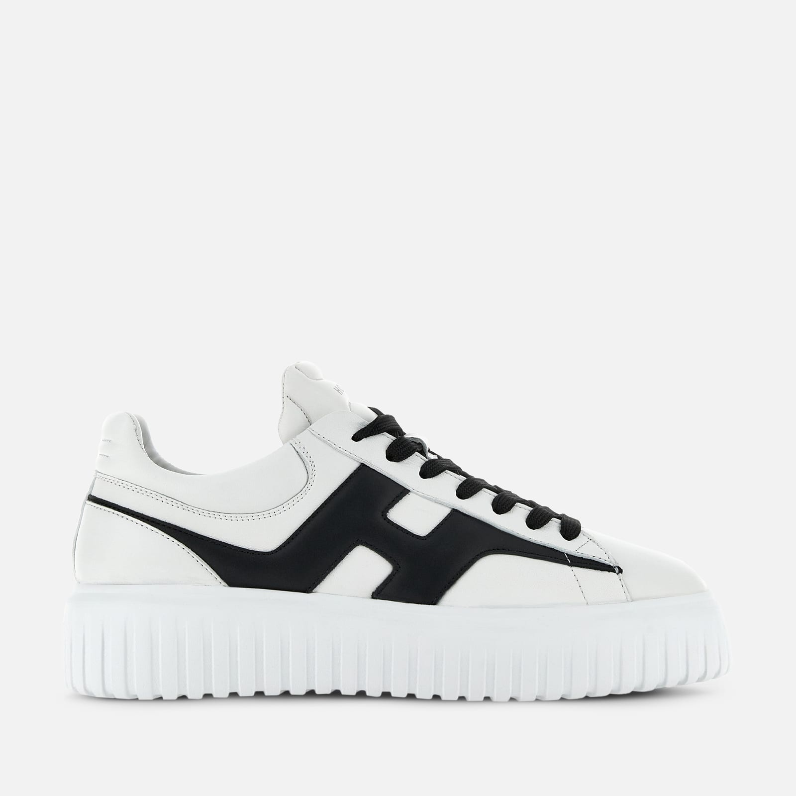 - Men's Hogan H-Stripes Sneakers - Made in Italy - Nappa leather upper - Side H - Memory foam insole - Rubber outsole - Maintenance and care cards included - Fabric dustbag included - Additional laces included A new style with sporty and versatile lines, the H-Stripes features an extralight outsole with vertical stripes. The upper, with a compact and balanced design, is characterized by an H that extends across the side. The upper trim, with stitching on the back patch, comes with a soft padding. This version is crafted in nappa leather, with a memory foam insole that guarantees comfortable cushioning. MOD. HXM6450FE91LE90001