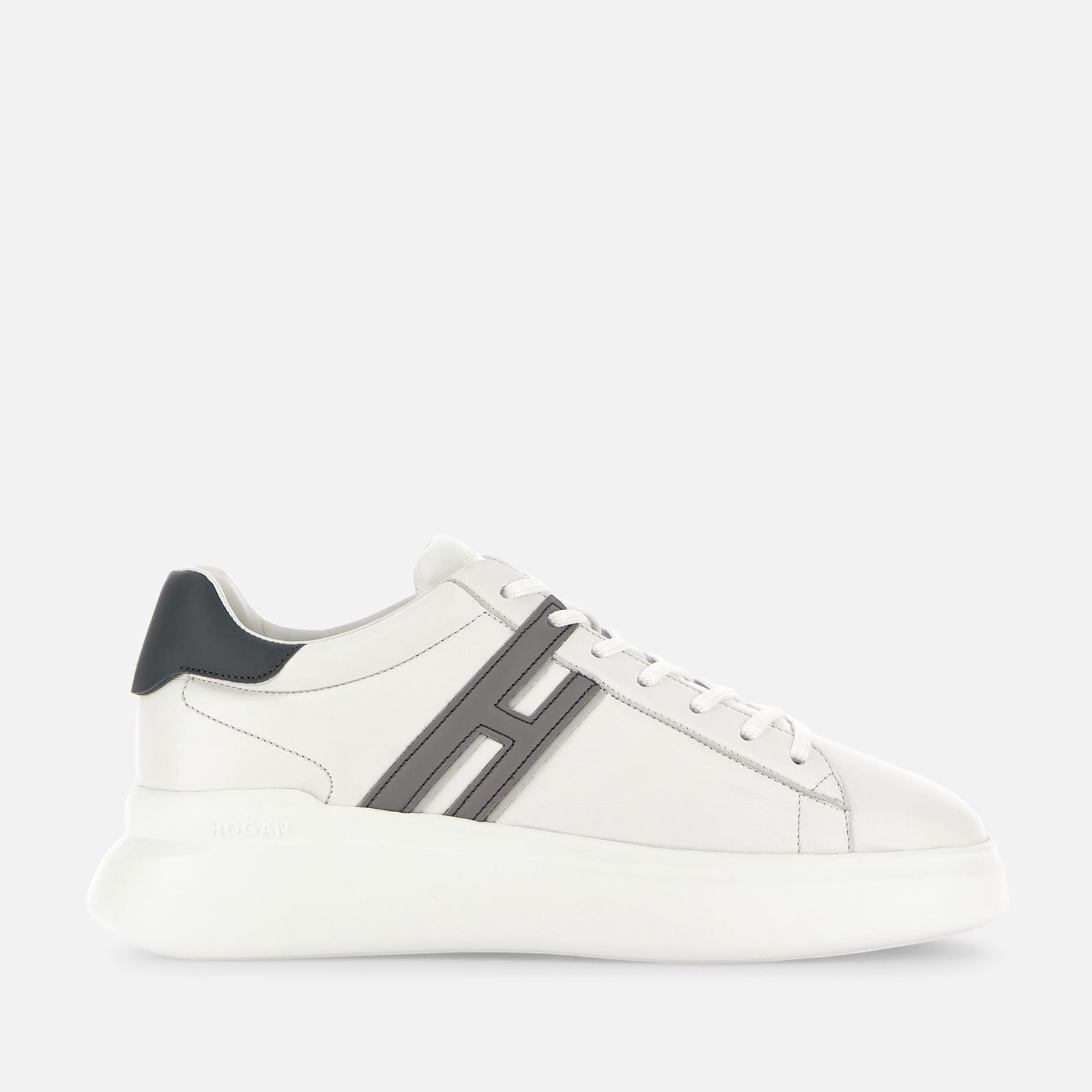 - Men's Hogan H580 Sneakers - Made in Italy - Nappa leather upper - Smooth leather side H and detailing - Memory foam insole 0.3 ins - Rubber outsole - Total height 1.8 ins - Maintenance and care cards included - Fabric dustbag included - Additional laces included The H580 sneakers were designed with the wind and its flow in mind, featuring harmonious volumes and an aerodynamic outsole. The nappa leather upper, with soft and essential lines, is the background of an extended H that ends in a lace pass. A style with an urban casual vocation, featuring a memory foam insole to guarantee a cushioned fit.