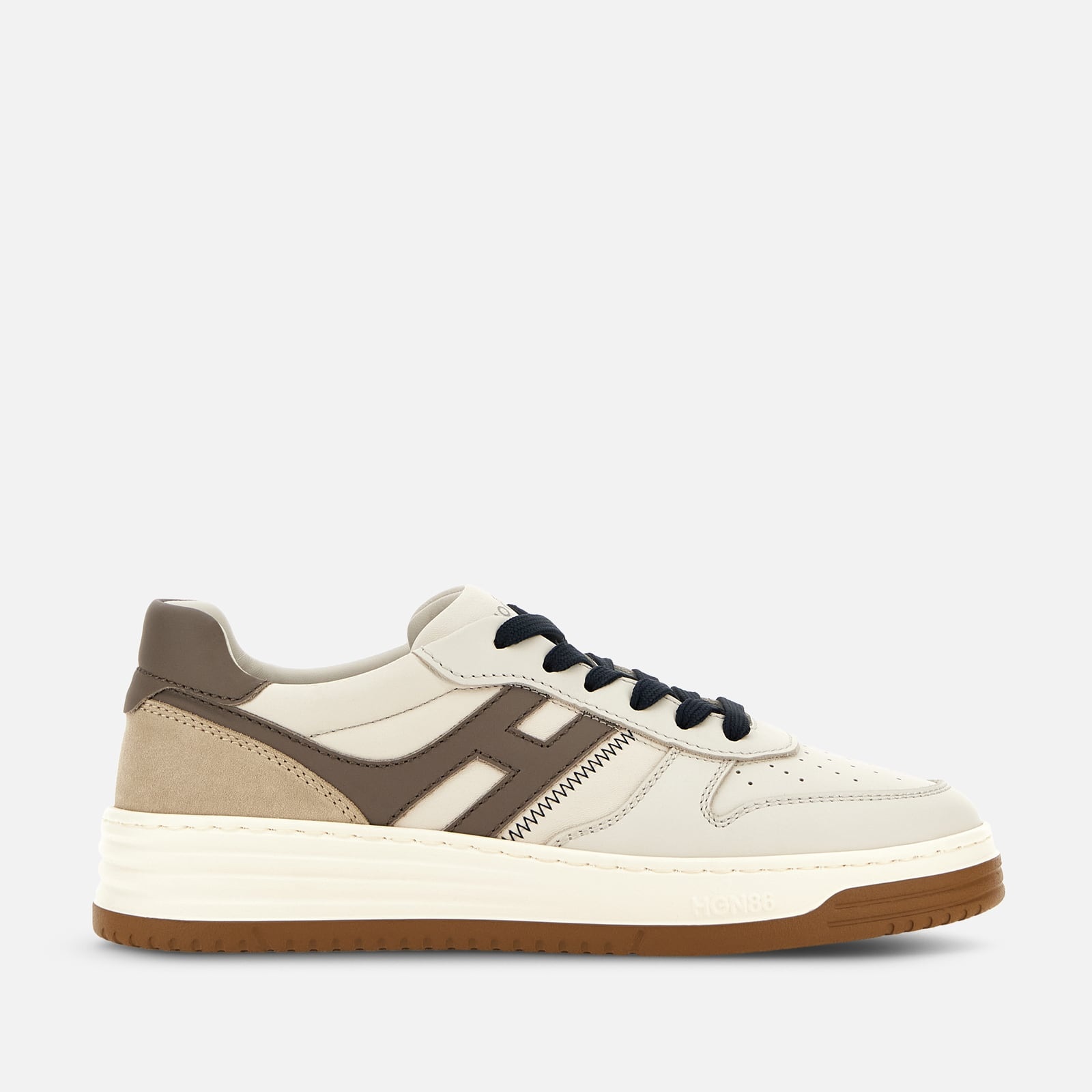 - Men's Hogan H630 Sneakers - Made in Italy - Smooth leather upper - Suede inserts - Smooth leather side H and detailing - Memory foam insole 0.4 ins - Rubber outsole - Total height 1.5 ins - Maintenance and care cards included - Fabric dustbag included - Additional laces included The Hogan H630 sneakers combine lines belonging to the basketball world and classic brand style. The smooth leather upper with suede detailing features an extended H that envelopes the heel. The outsole is crafted in extralight EVA, with embossed HGN86 logo on the side and shaded stripes that reinterpret the iconic Rebel grooves. Must-have for the contemporary wardrobe, this dynamic style is complemented by a memory foam insole that ensures softness and cushioning.