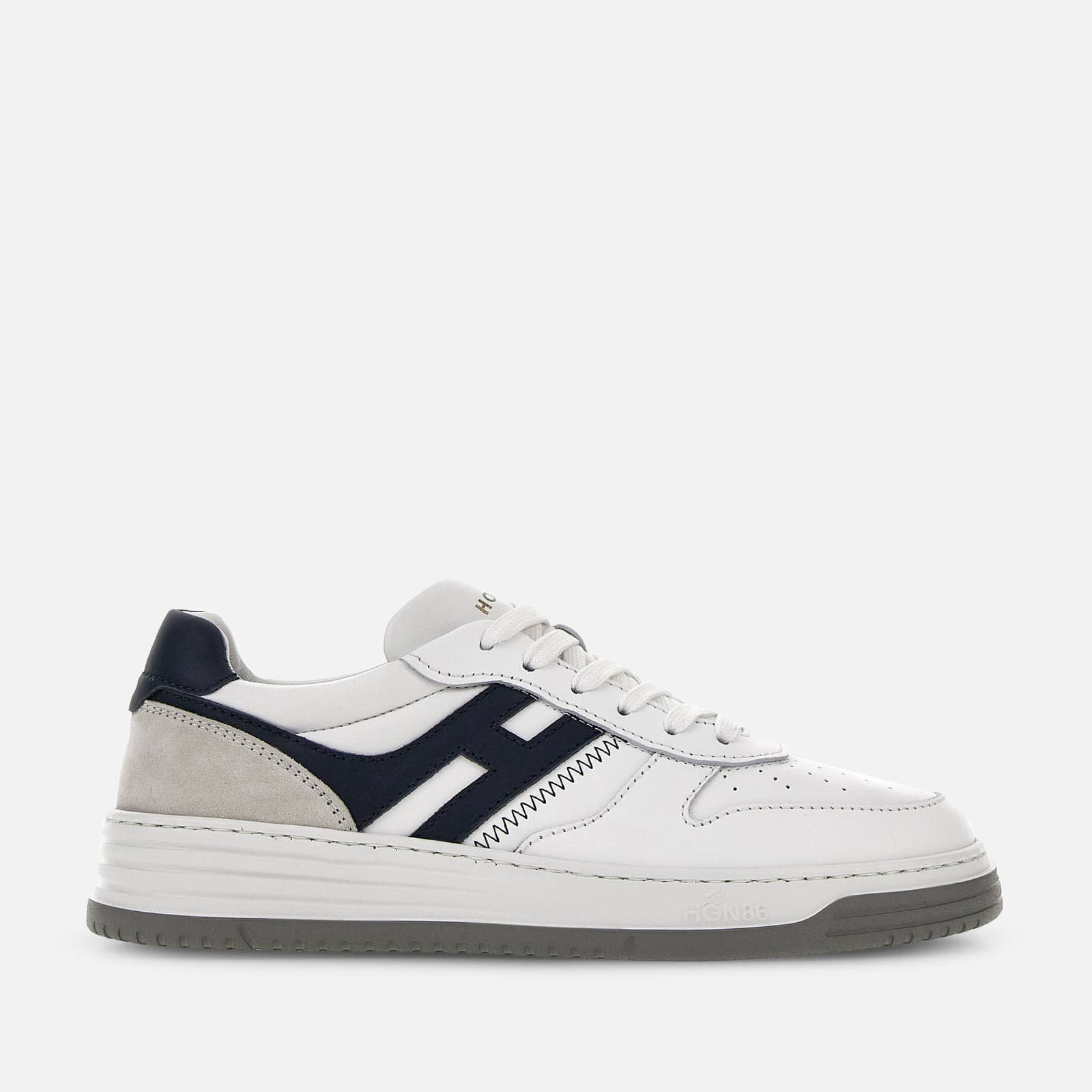 - Men's Hogan H630 Sneakers - Made in Italy - Smooth leather upper - Suede inserts - Smooth leather side H - Memory foam insole - Rubber outsole - Maintenance and care cards included - Fabric dustbag included New sneakers with retro vibes, the Hogan H630 High Top combines lines belonging to the basketball world and classic brand style. The smooth leather upper with suede inserts features an extended H that envelopes the heel. The outsole is crafted in extra-light EVA, with the new embossed HGN86 logo on the side and shaded stripes that reinterpret the historic Rebel grooves. True must-have for the contemporary wardrobe, this dynamic style is completed by a memory foam insole that ensures softness and cushioning. MOD. HXM6300EU50ODZ11G1