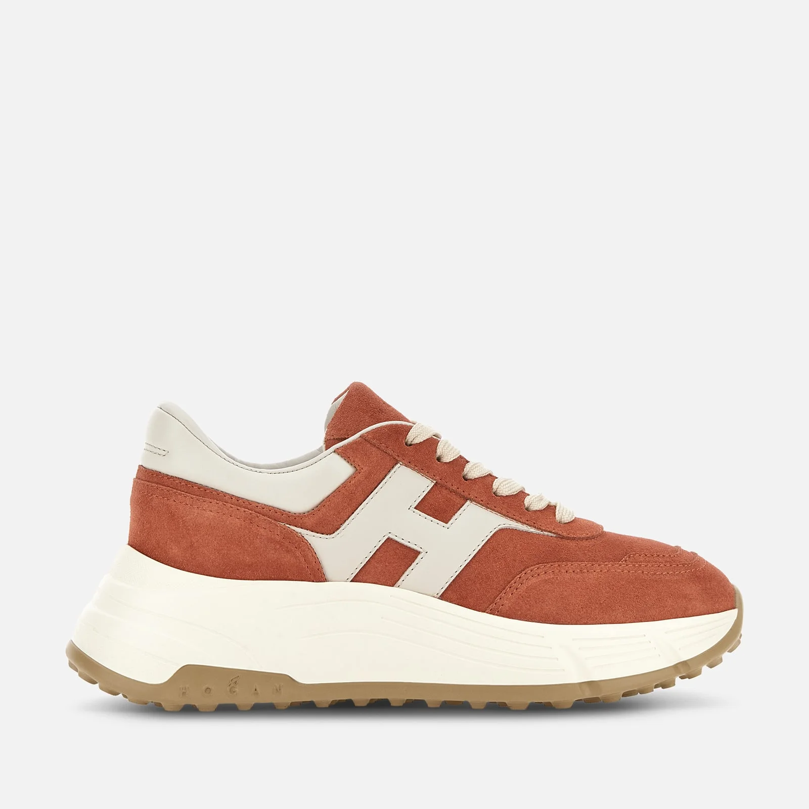 - Women's Hogan Hi-Fi Sneakers - Made in Italy - Suede upper - Smooth leather side H - Nappa leather detailing - Memory foam insole 0.3 ins - Rubber outsole - Total height 2.6 ins - Maintenance and care cards included - Fabric dustbag included - Additional laces included The Hogan Hi-Fi sneakers take a feminine twist on the studded Hyperlight outsole, with a raised platform for height and elegance. Recalling the 80s sporting iconography with their technical finishing and urban vocation, they feature a combination of soft and snappy lines. The upper comes here crafted in suede, with a maxi side H. An energetic athleisure style, with a memory foam insole to guarantee extra comfort and a cushioned fit.