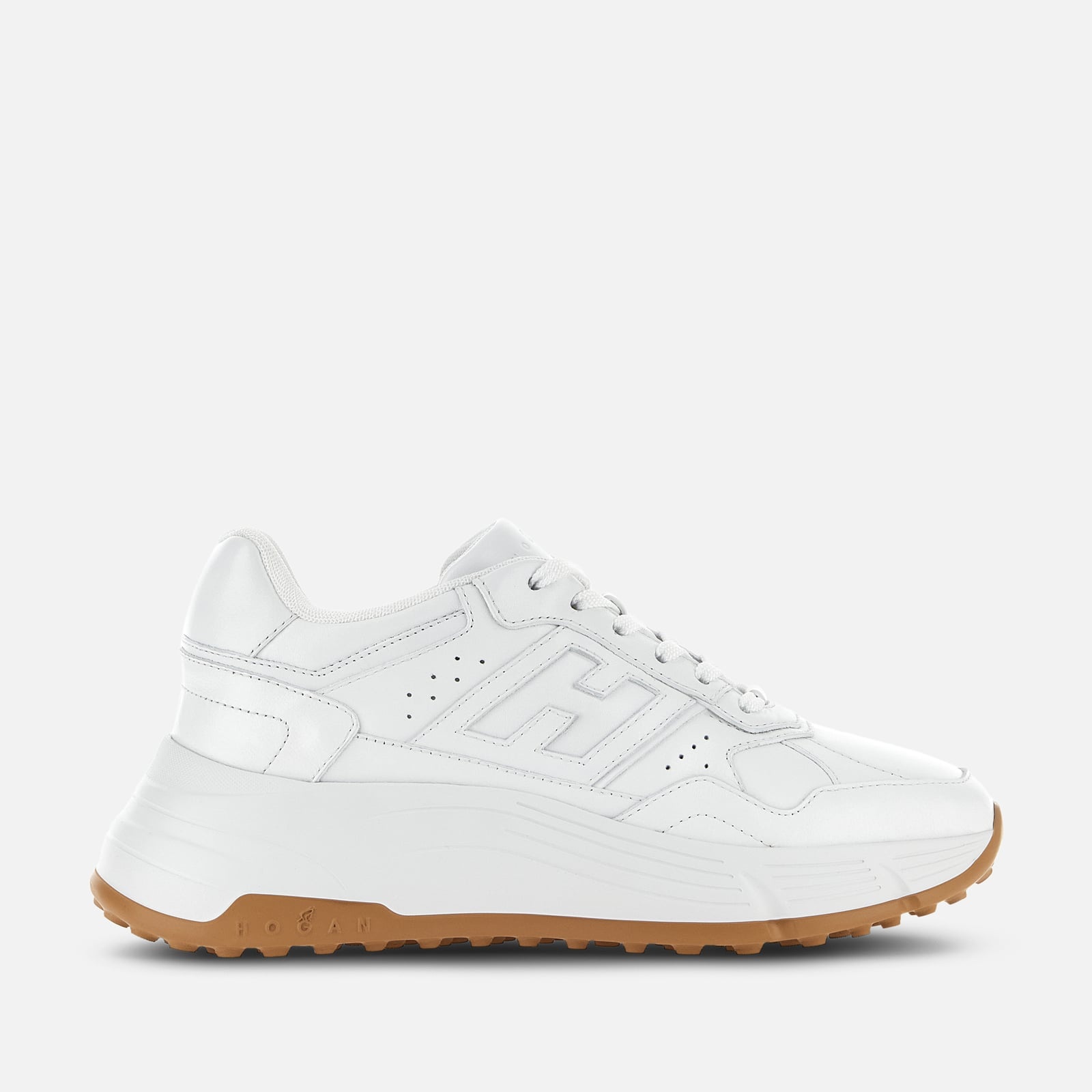 - Women's Hogan Hi-Fi Sneakers - Made in Italy - Smooth leather upper - Carved side H - Memory foam insole 0.3 ins - Rubber outsole - Total height 2.6 ins - Maintenance and care cards included - Fabric dustbag included - Additional laces included The Hogan Hi-Fi sneakers take a feminine twist on the studded Hyperlight outsole, with a raised platform for height and elegance. Recalling the 80s sporting iconography with their technical finishing and urban vocation, they feature a combination of soft and snappy lines. The upper comes here crafted in smooth leather, with a maxi H on the side band. An energetic athleisure style, with a memory foam insole to guarantee extra comfort and a cushioned fit.