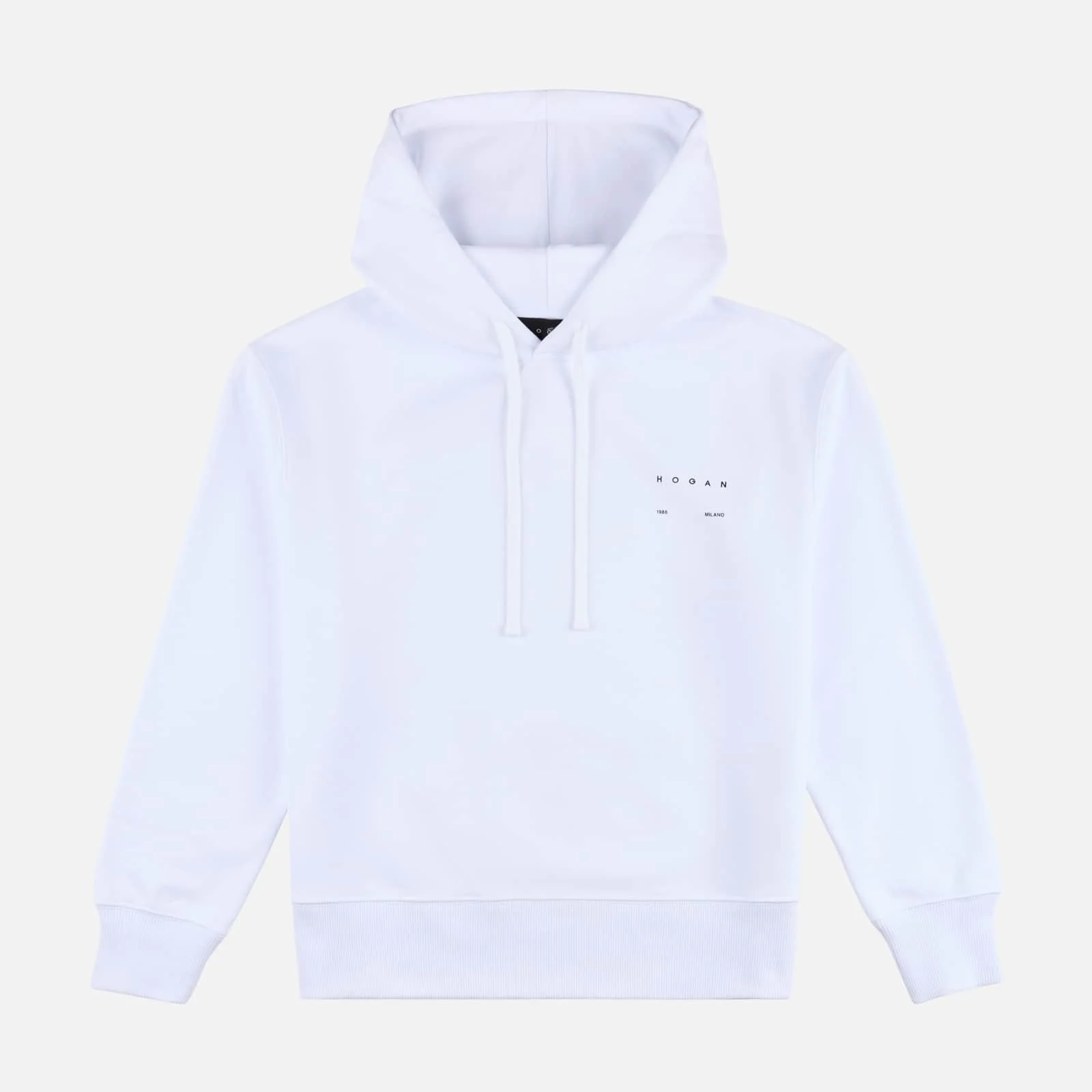 - Sweatshirt with hood - Made in Italy - Fitting: regular - Composition: 100% cotton, hems 95% cotton, 5% elastane - Maintenance and care cards included Sweatshirt in cotton with hood and drawstring. Featuring ribbed knit inserts on the cuffs and bottom, it comes with the contrasting Hogan logo printed on the chest.