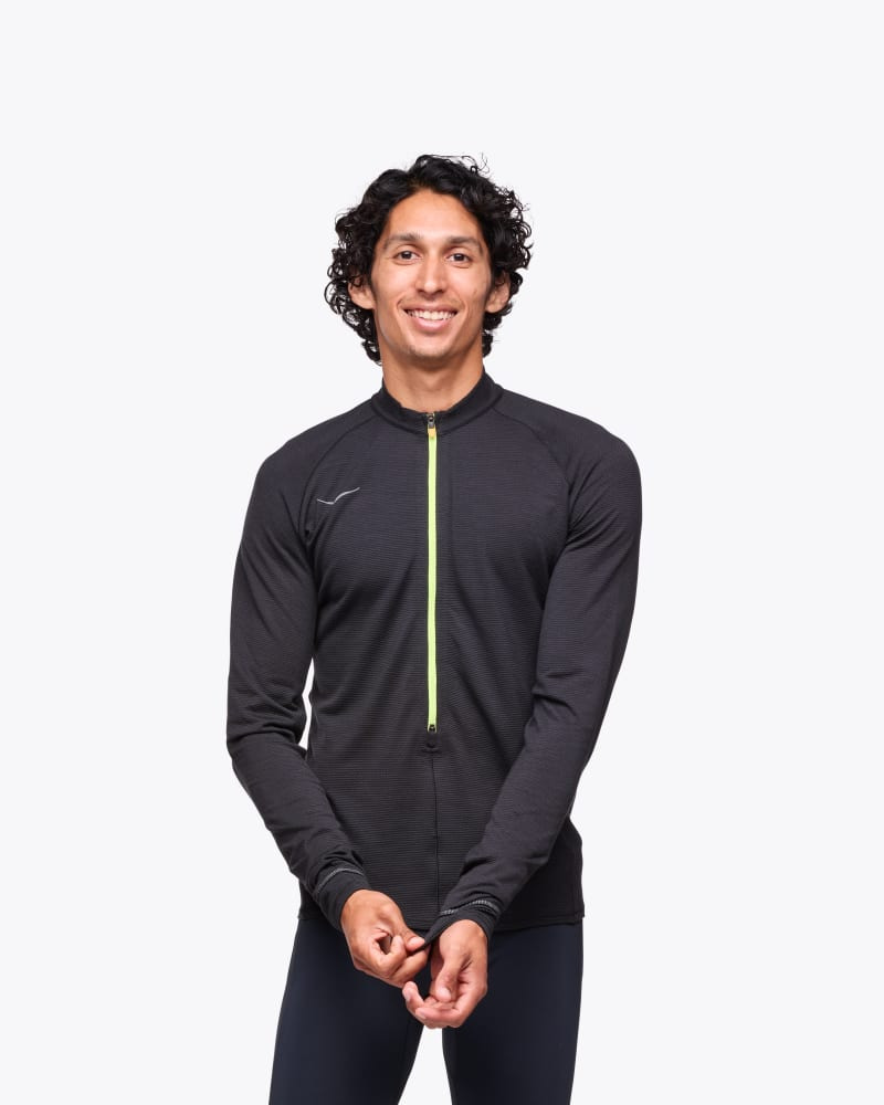 More than your standard mid-layer, our Basezip goes the distance with excellent thermoregulation properties. Soft, breathable, moisture-wicking 56% (RWS) wool blend. Designed to adapt to winter's ever-changing forecast, we've added a cozy mock neck, thumbhole construction, and two-way zip so you can vent on the fly. Two-way elongated front zip. Anti-chafe stitching. Thumbhole construction at wrist. 360-degree reflectivity across HOKA and bird logos.