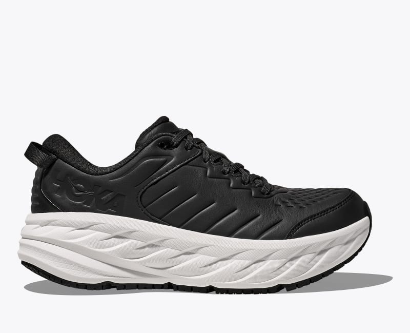 The Bondi SR takes the most cushioned shoe in the HOKA road-shoe lineup and reworks the silhouette to handle the demands of daily life. Updated with water-resistant leather, a slip-resistant outsole and EVA midsole to ensure all-day cushion, this workplace warrior features an ultra-grippy, full ground contact rubber that stands up to the demands of the service industry and medical field alike. Water-resistant leather. Memory foam collar. EVA midsole. Early stage Meta Rocker. Slip-resistant rubber and tread. Tongue lining wrap.