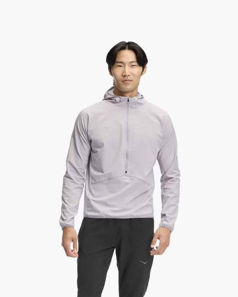 Meet a half zip that delivers a whole lotta protection. Coated with a water-resistant finish to shield from the elements, we've lined our woven outer material with soft micro grid back fleece and paneled in stretch knit through the arms and sides for maximal movement. Equipped with internal mitts to keep you warm when logging those crack-of-dawn miles, we've enlisted a two-way zipper for ventilation. You'll also find a stealthy chest pocket to secure keys/cards and back pocket for stashing discarded beanies. Stretch woven material with DWR finish and internal brushed grid back fleece material. Stretchy bushed interlock knit panel on sides. Internal zip chest pocket. Back zip pocket. Brushed interlock knit internal mitts. 360-degree reflectivity across taping and HOKA and bird logos.