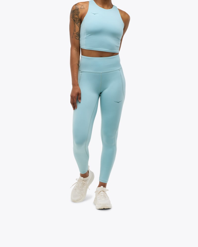 Secret's out. We're obsessed with comfort. Designed to feel like a gentle hug, the Elaro Knit Tight cues up insanely soft, ultra-stretchy fabric that's brushed on the inside for next-level comfort. Cozy, but never restrictive, this high-waisted silhouette affords complete coverage and includes a drop pocket on each side for stashing the essentials. 75% recycled polyester/elastane/Bio Wick material. Fold-over high waistband. Multiple pockets including drop-in pockets at the side. Micro vanity gusset. Reflective bird and HOKA heat transfer logo.
