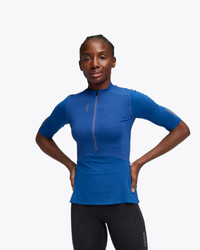 Designed and wear tested in tandem with elite HOKA athletes, the Sky Breeze Short Sleeve Zip delivers a lightweight base layer that effortlessly adapts to the changing temps. Strategically body mapped to ensure optimal thermoregulation, this slim-fit silhouette features a Dri Release blend at the lower torso and sleeves to maintain warmth when the mercury dips. Finished with a honeycomb knit at the back panel to mitigate moisture where the hydration pack sits, we've included an elongated zipper to vent on the fly. Mixed material offering. Quick drying. Sweat wicking. Slim fit silhouette. Anti-chafe mock neck construction. Elongated front zip for ventilation on the go. Reflective hits. HOKA Women's Sky Breeze Short Sleeve Zip Shoes Shirt in Ultramarine, Size Large